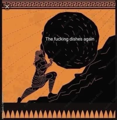 I saw this image on Pinterest some time back and I saved it, if for nothing it's a funny relatable meme, I do the dishes everytime only for the short satisfaction of seeing them clean and using them, then they become dirty again and I do them again only for another short satisfaction of seeing them clean and using them and now we're back to this same fucking hill, the dishes again.